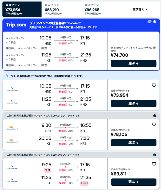 ある日の、東京-プノンペンの往復航空券検索結果を載せておきます。